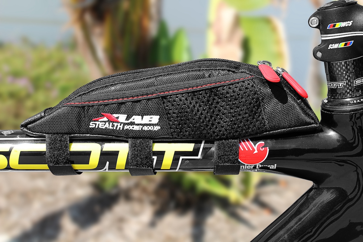 Armazenamento universal montado na top tube, otimizado para bicicletas com mesa inclinada ou cabos passando pelo top tube.